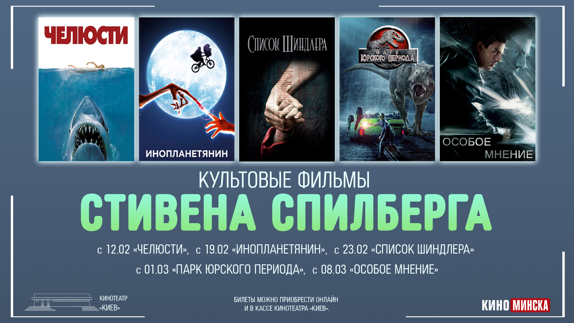 В честь юбилея одного из величайших режиссёров современности — Стивена Спилберга — кинотеатр «Киев» подготовил особый кинематографический марафон, который подарит зрителям уникальную возможность окунуться в мир классических фильмов мастера на огромном экране.