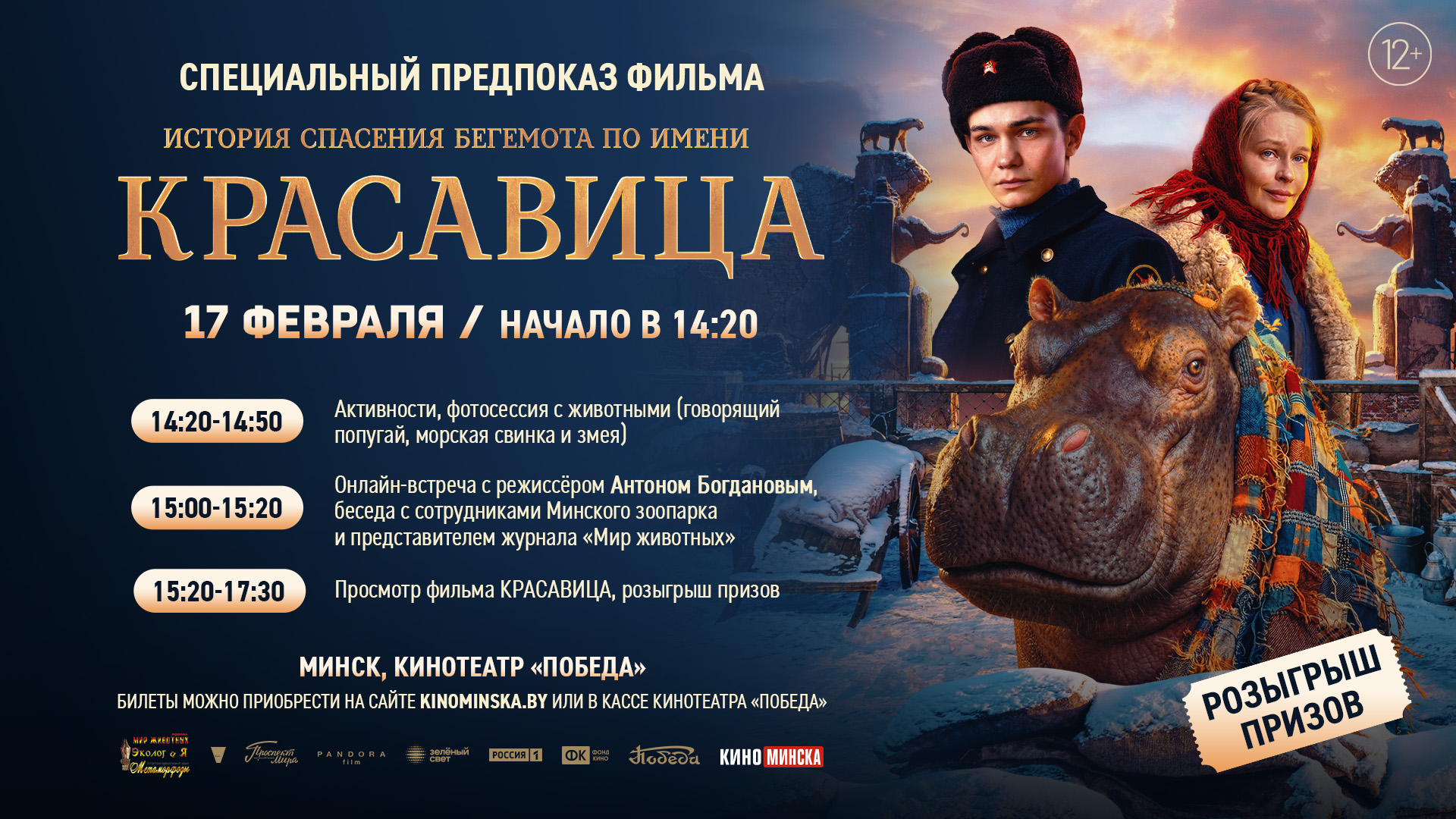 Кинотеатр «Победа» приглашает на специальный премьерный показ фильма «Красавица» – трогательной военной драмы о подвиге сотрудников Ленинградского зоосада, спасающих бегемотиху по кличке Красавица в условиях голодной зимы 1941 года.